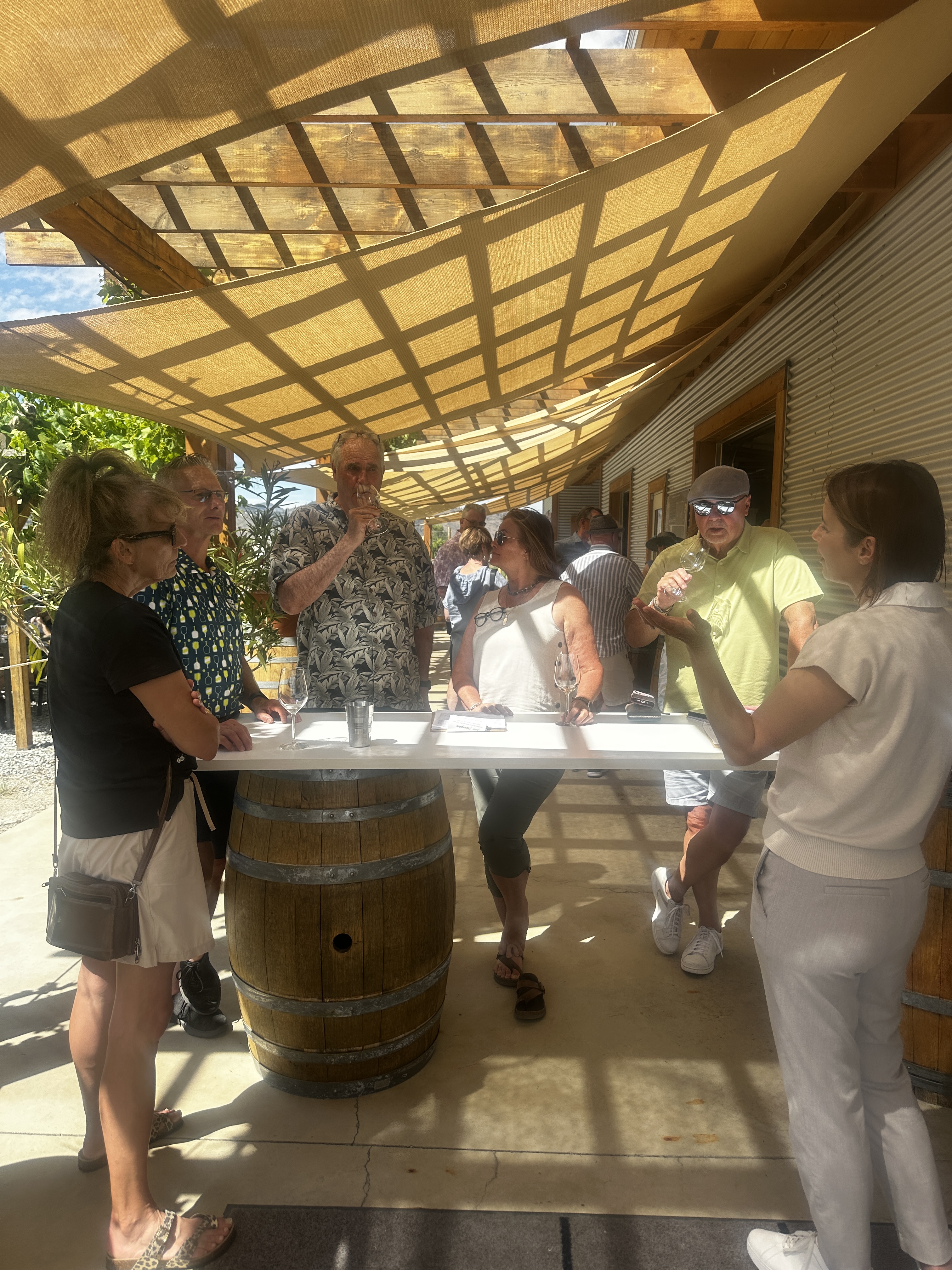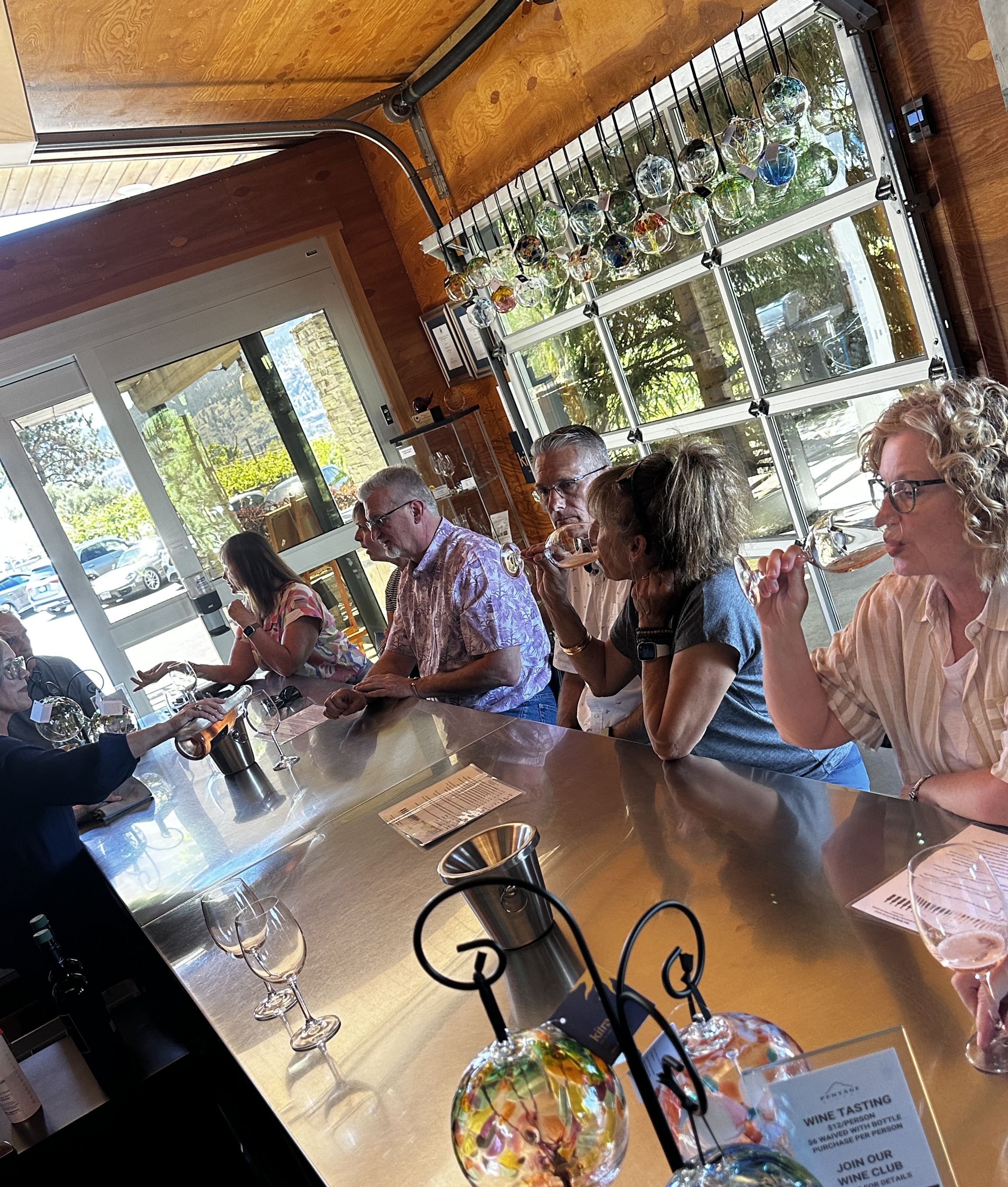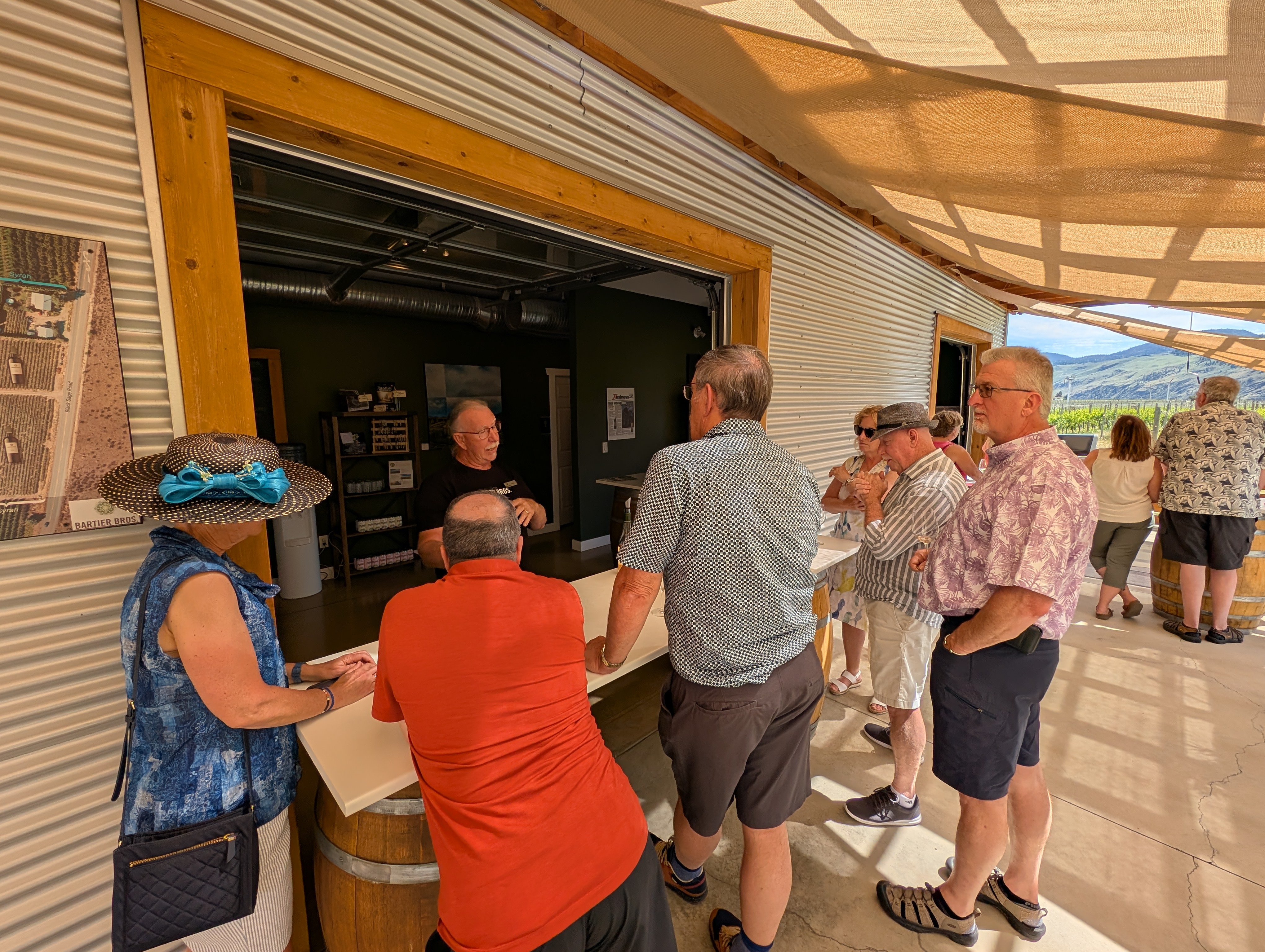We kicked things off at Serendipity Winery, nestled at the north end of the Naramata Bench. Most of the crew made it—just four still en route—but that didn’t slow us down. The tasting delivered a few pleasant surprises, and before we knew it, the shopping had officially begun. Because nothing says “wine tour” like adding a few bottles (or cases) to the growing stash in the trunk.