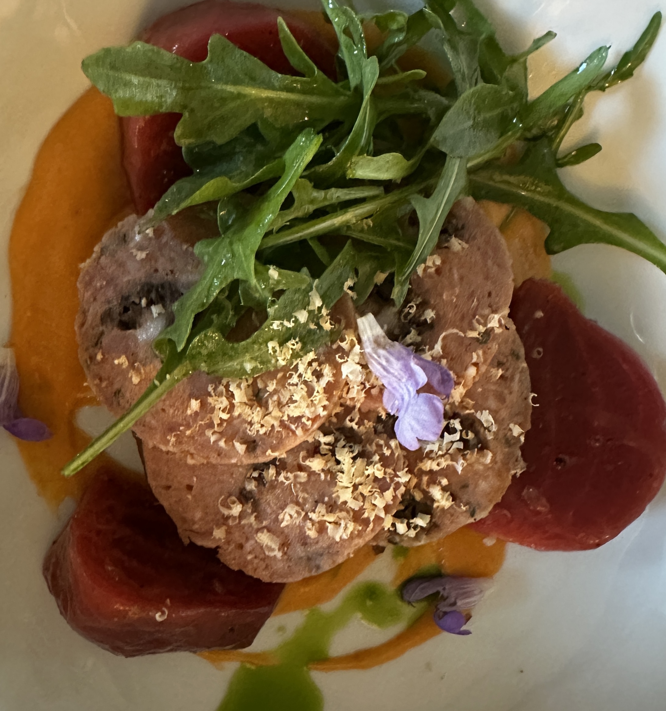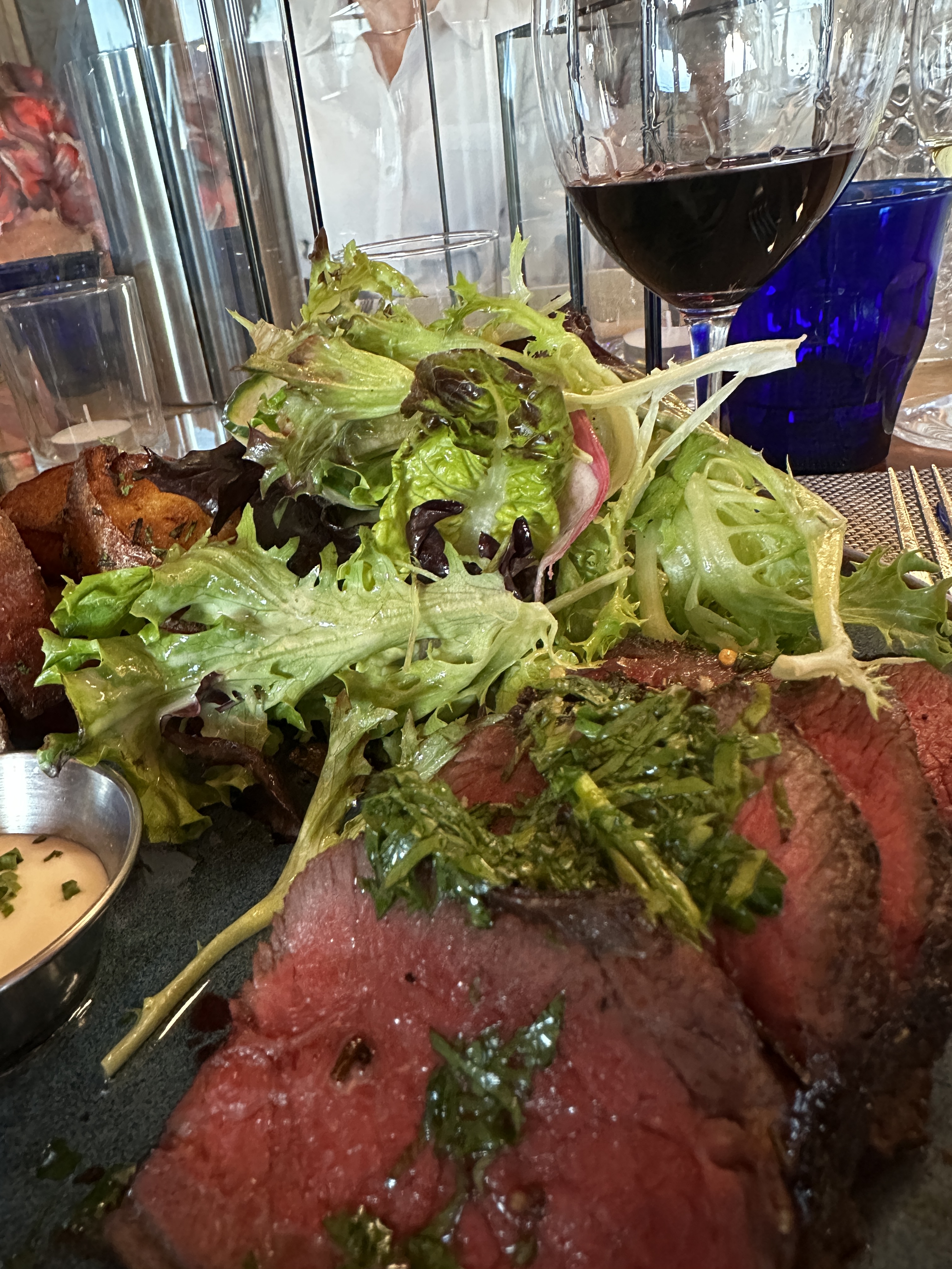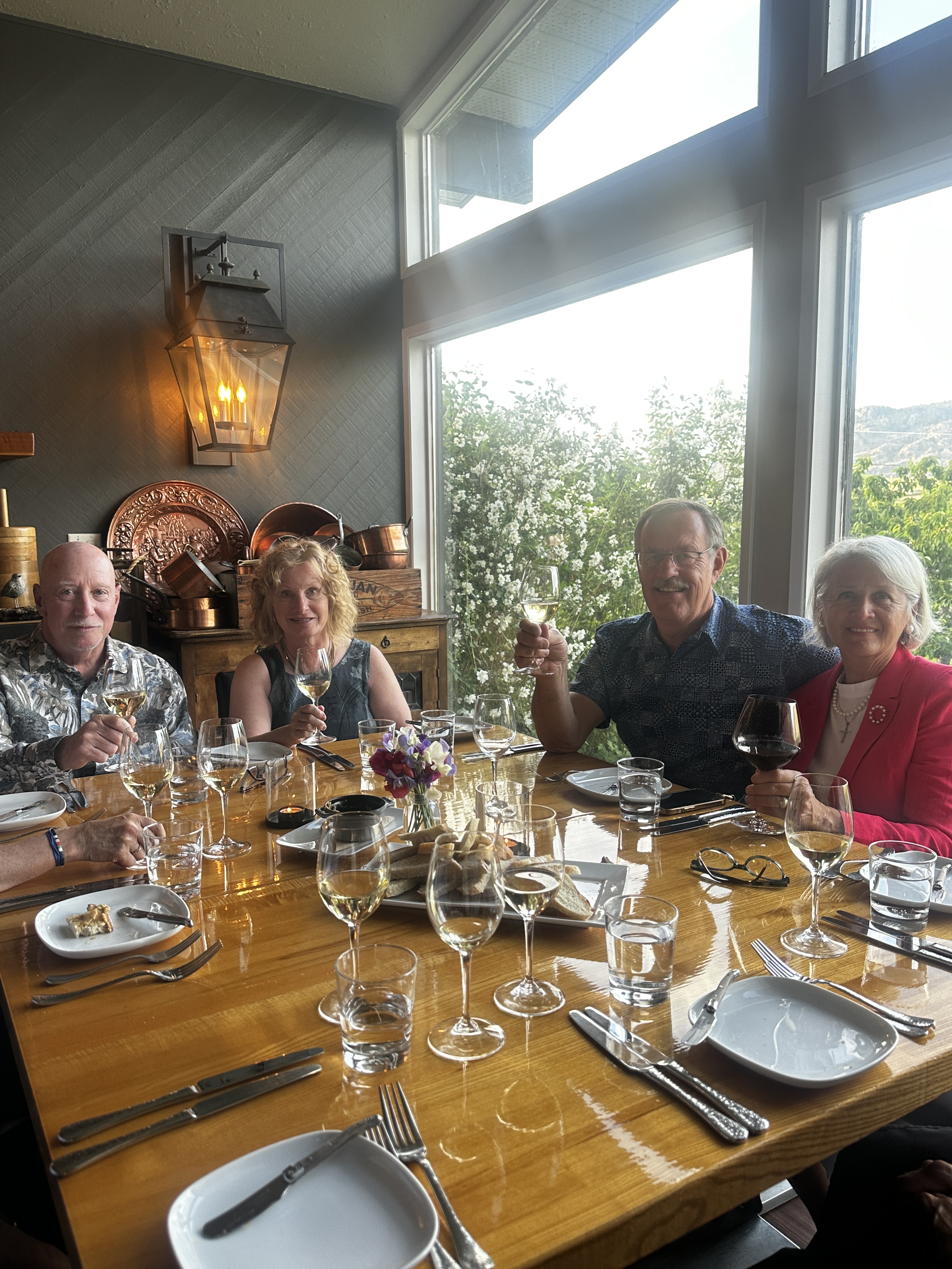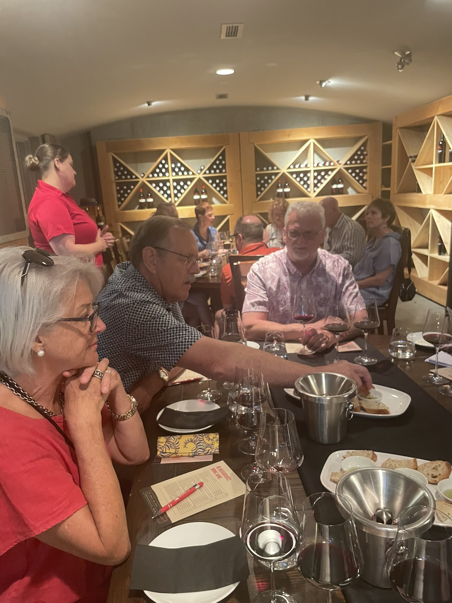 Dinner was magic. We were joined by four more friends—Bill and Joanne, Frank and Dagmar—who came just for the evening. Every course was a showstopper: elegantly plated, perfectly executed, and paired with wines we’d brought from Joe and Shelley’s cellar, our own stash, and a few fresh purchases. We even ended on a high note with port.