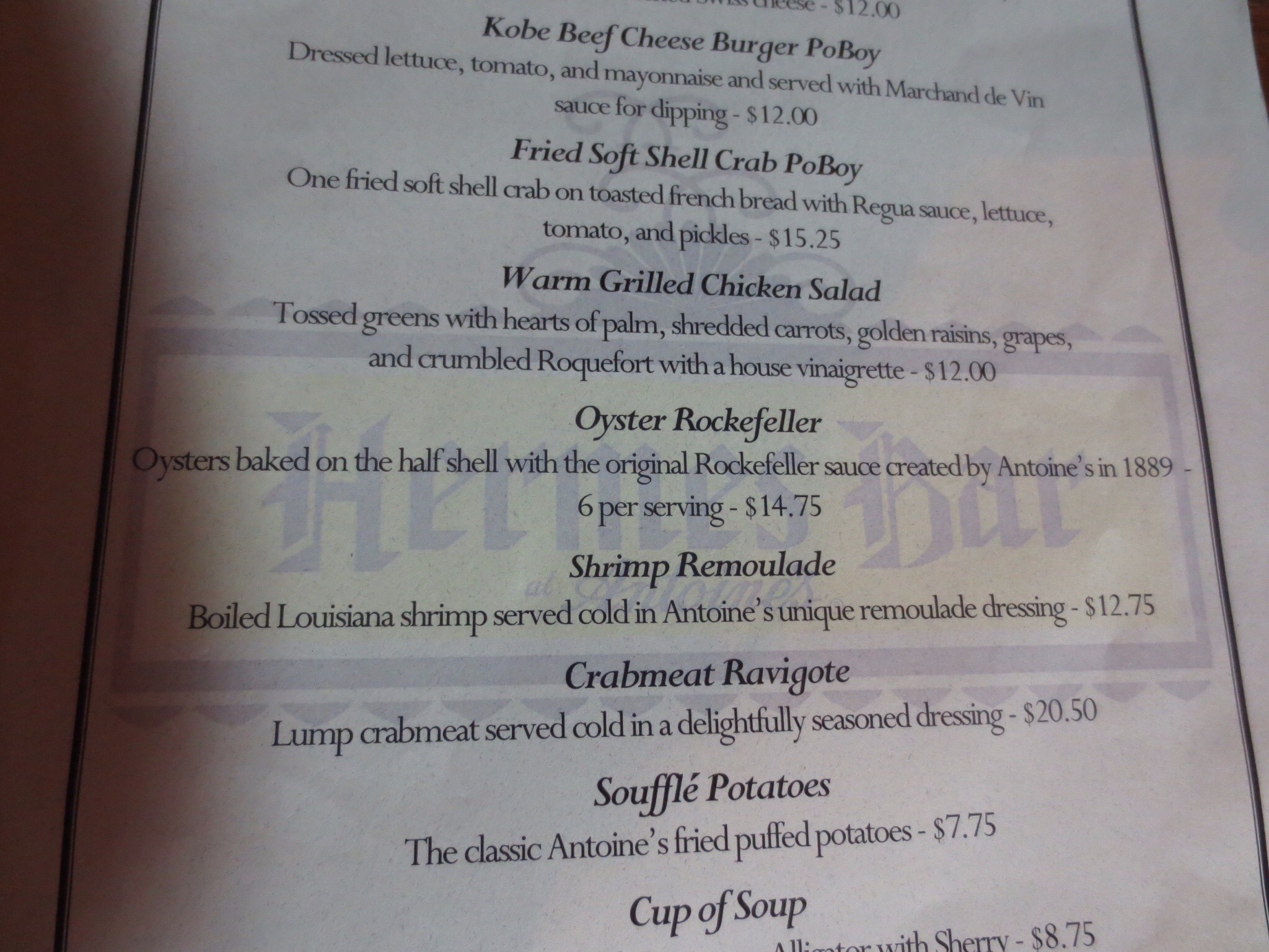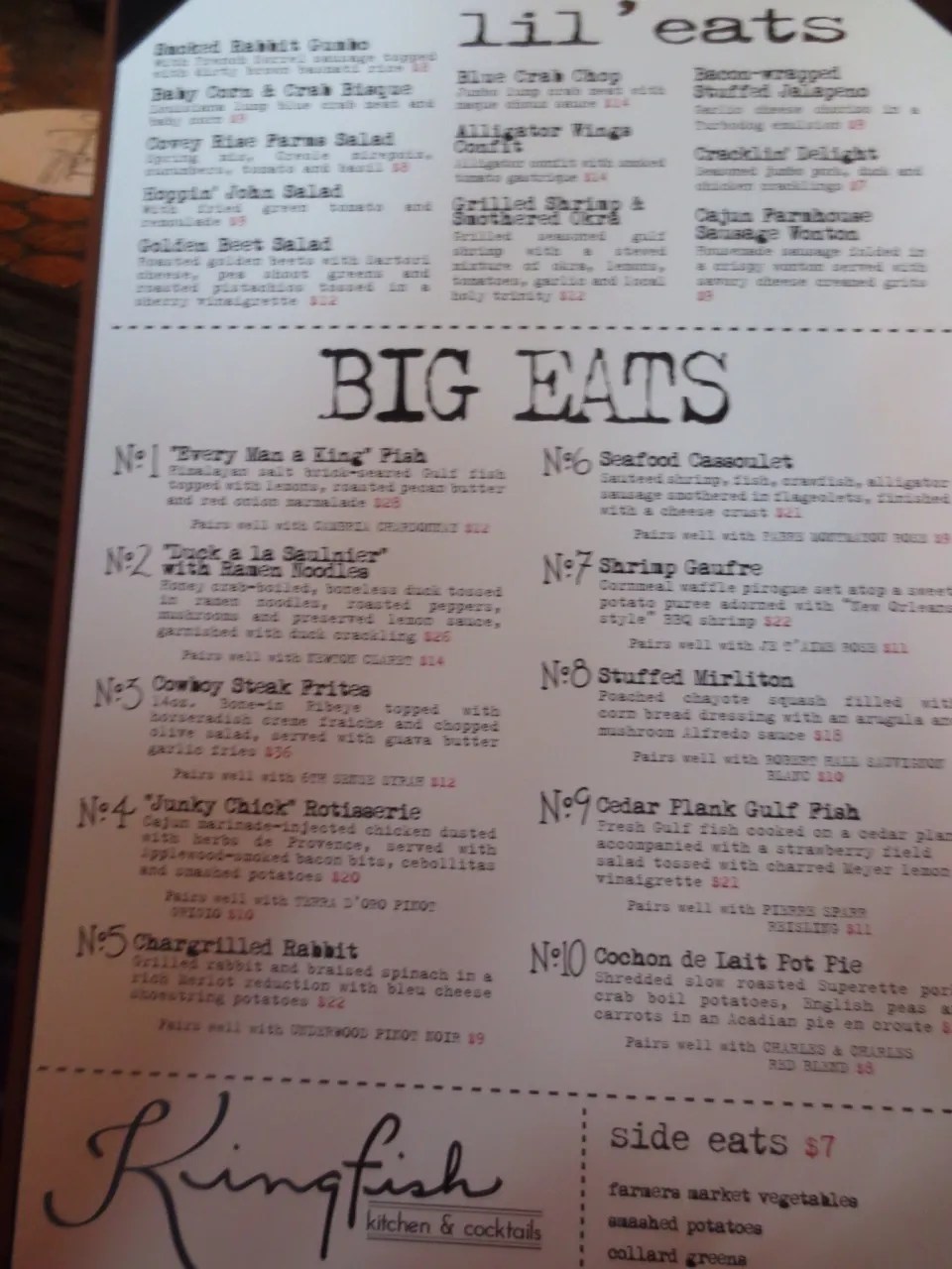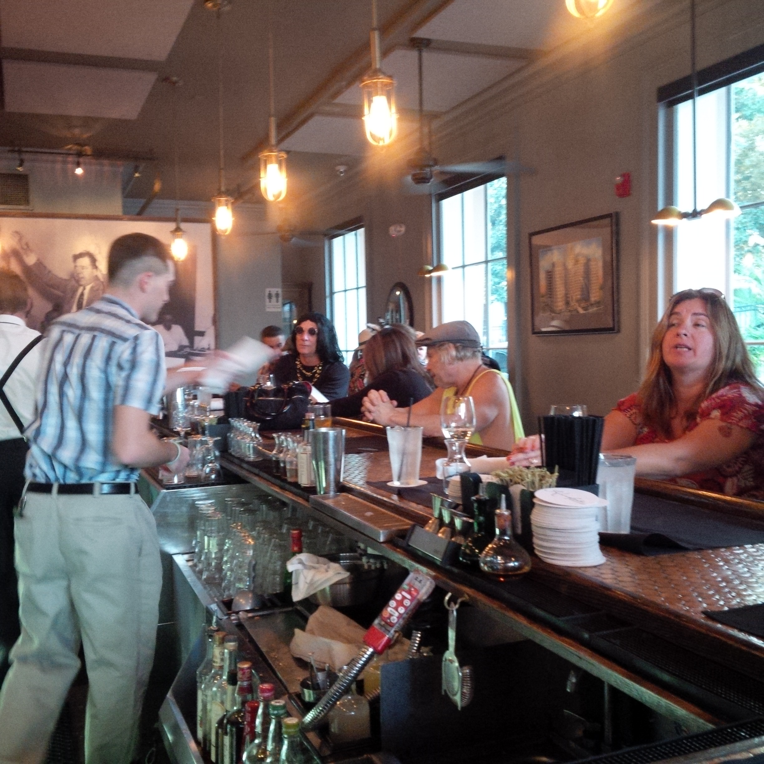 Stop at Kingfish for a substantial supper since we know what is coming next. Sat at the bar and met Chris the bartender who was a wealth of information in all things cocktails. Other bartenders were dressed at Forest Gump and Jonah Hill. Food was awesome. The chef was Brangelina’s chef at one point in his career. We all had different dishes – duck, rabbit, pork and shrimp. Very reasonable bill for the wine and food that we had.