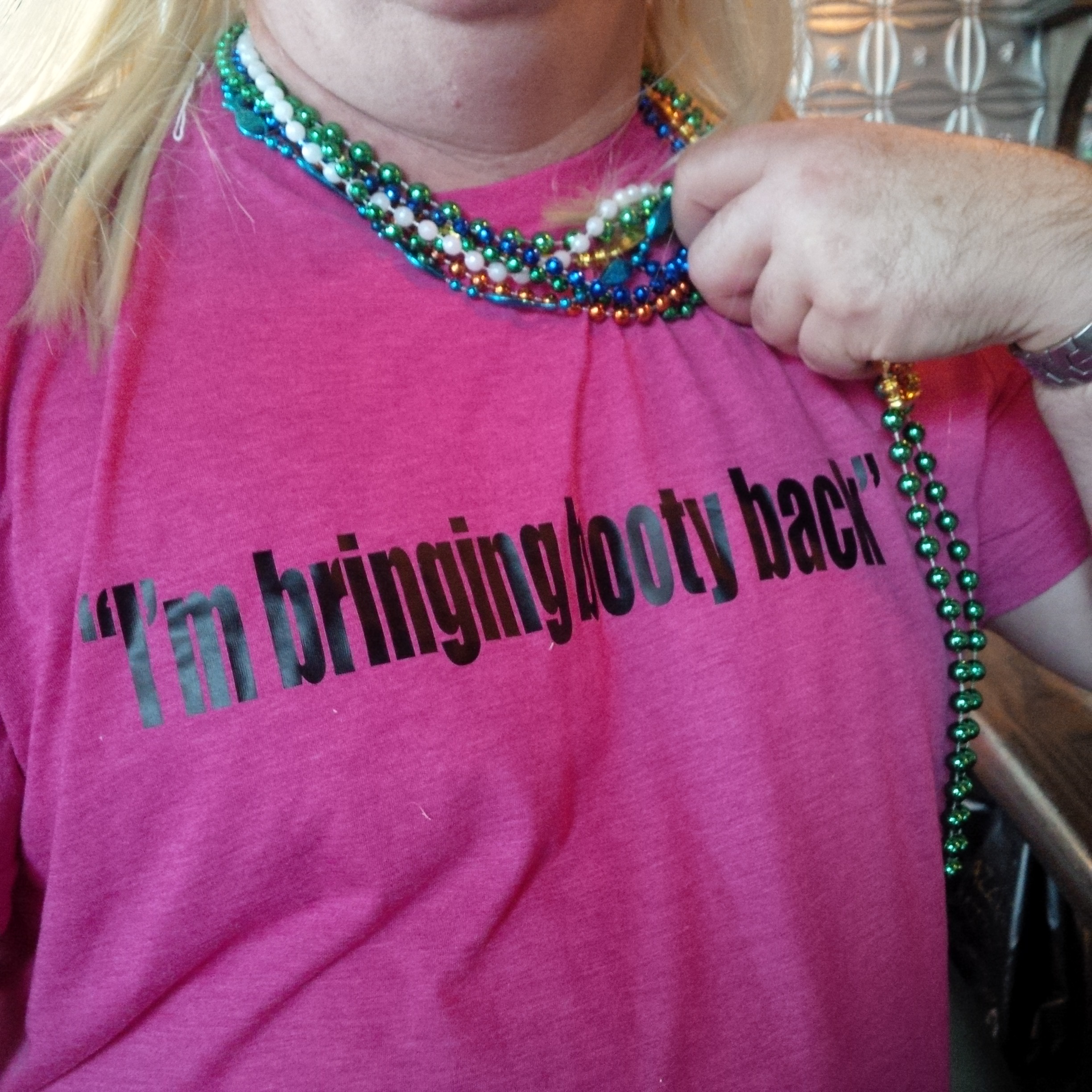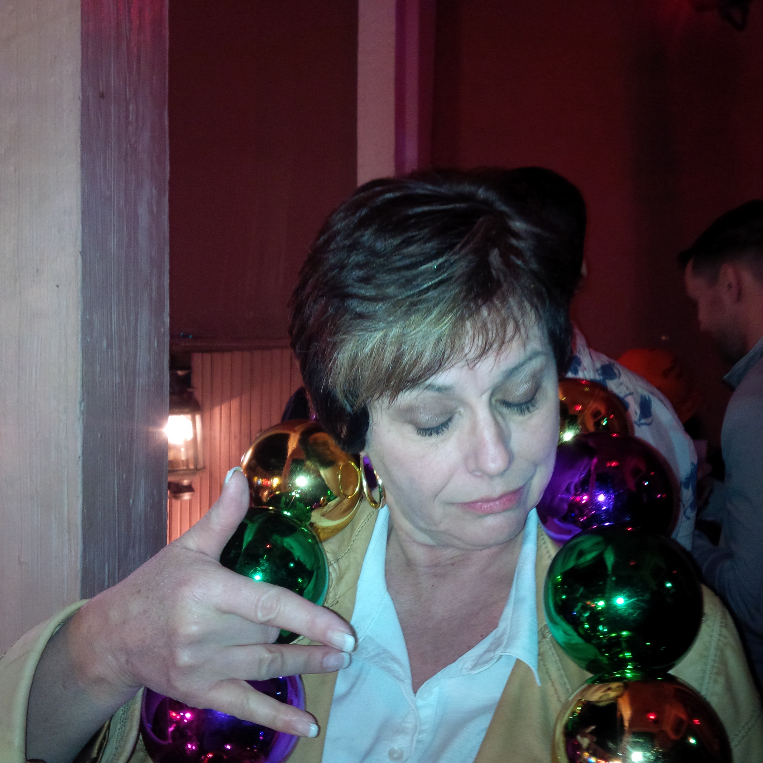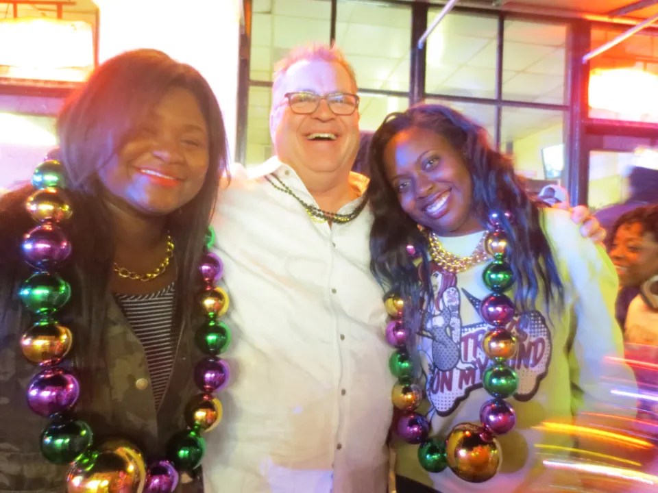 Liz was the first to earn beads. We got bus passes and headed off to take the street car to the garden district. Didn’t get very far and got off because we couldn’t take David’s moaning and groaning of a full bladder :-))). Changed direction to catch the parade. Had to stop for a snack so we had a washroom.