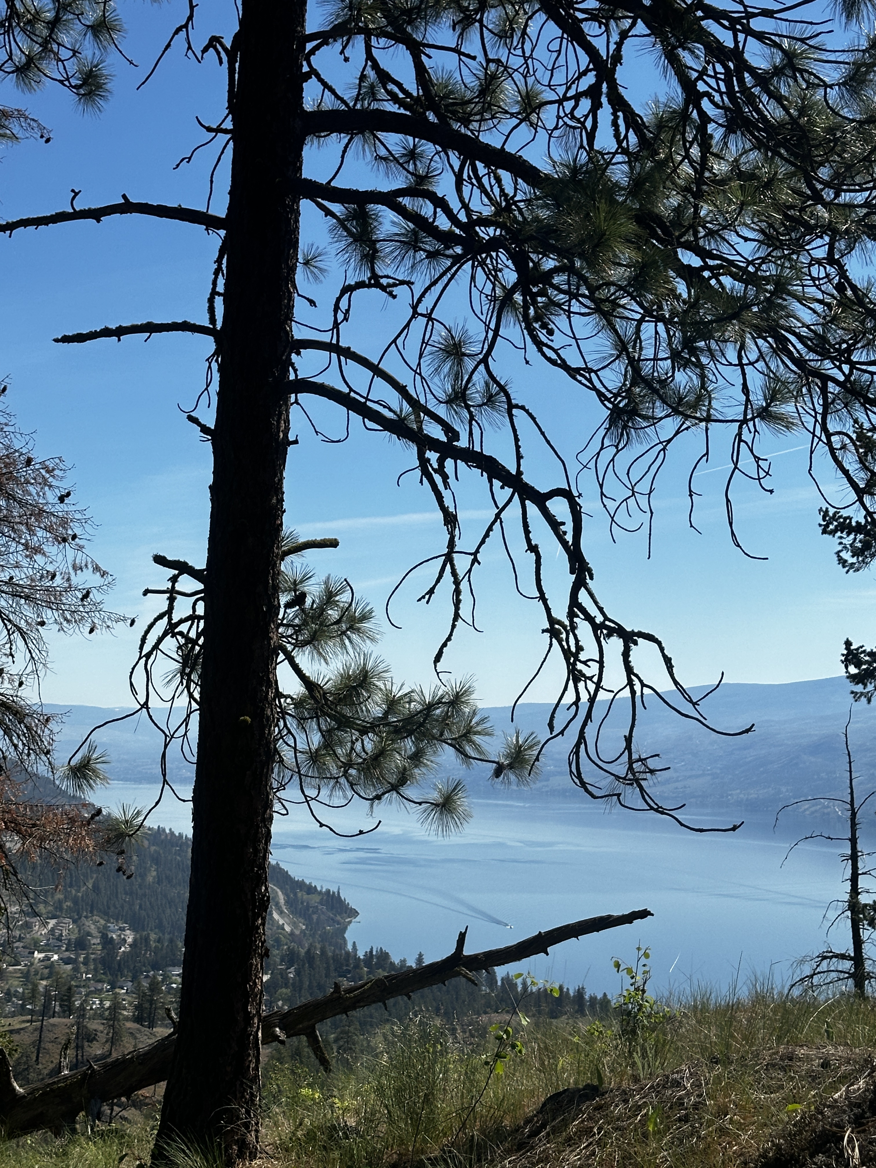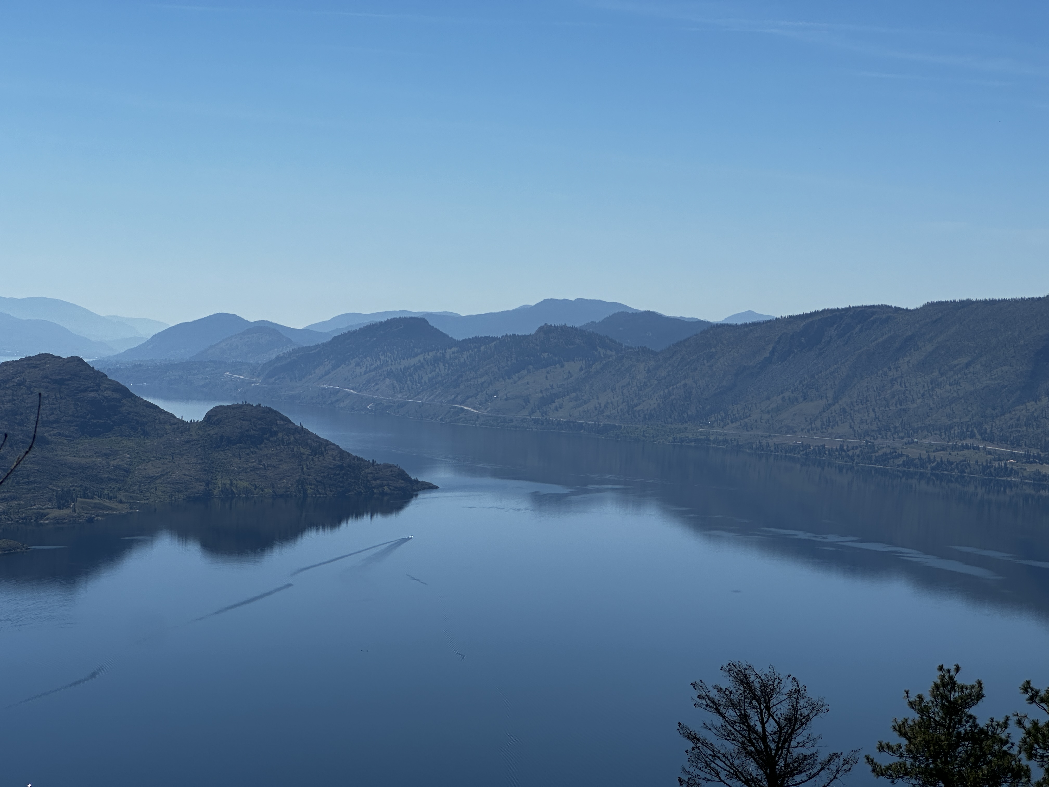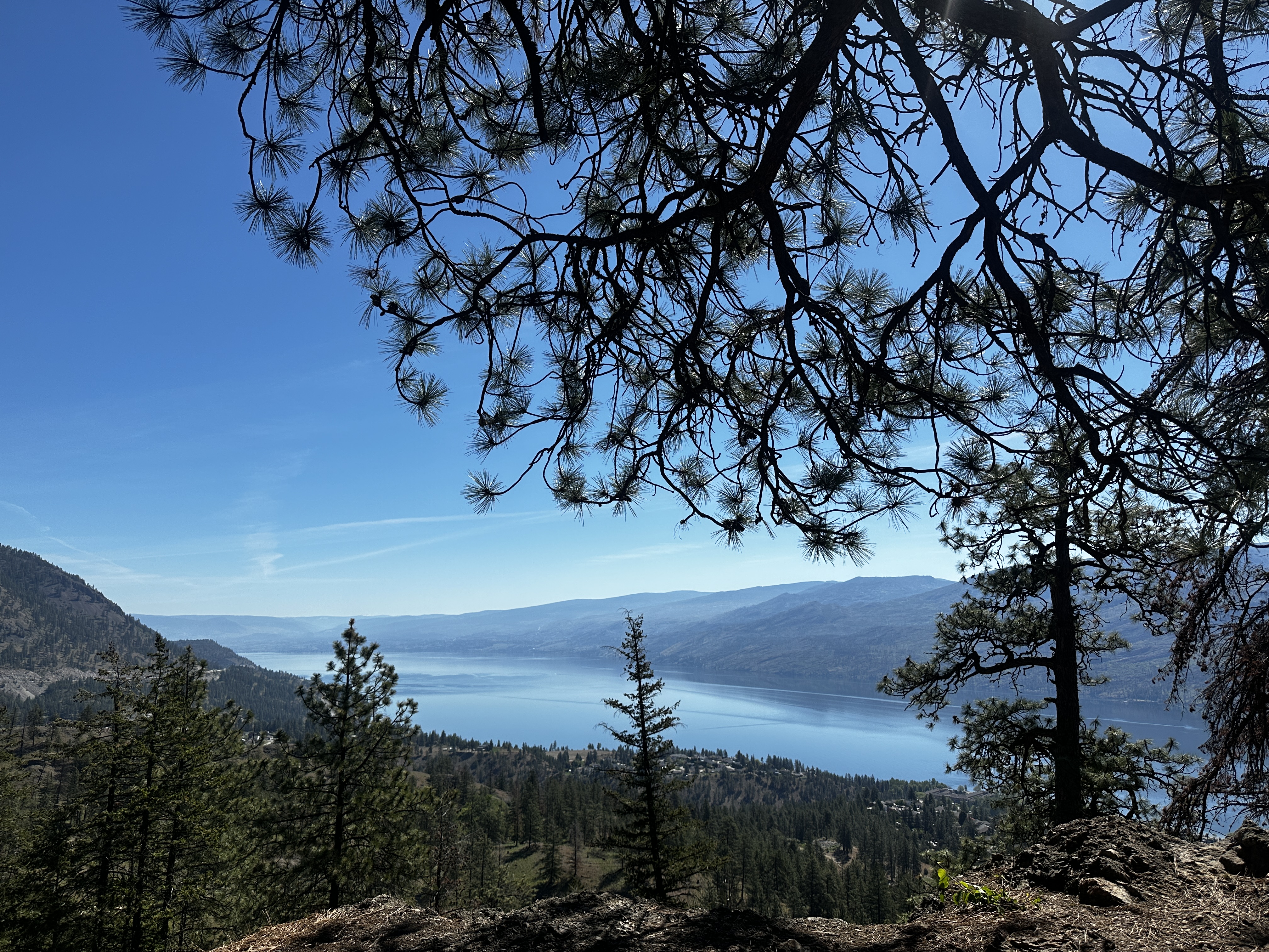 Perched at a bend in Okanagan Lake, the summit offers sweeping panoramas in every direction. The lake itself stretches 135 km (84 miles) in length, between 4 and 5 km (2.5 and 3.1 miles) wide, and plunges to a depth of 761 feet (232 m). From the peak, you can look north past Kelowna and almost all the way to Vernon, south toward Penticton, and east across Okanagan Mountain Provincial Park.