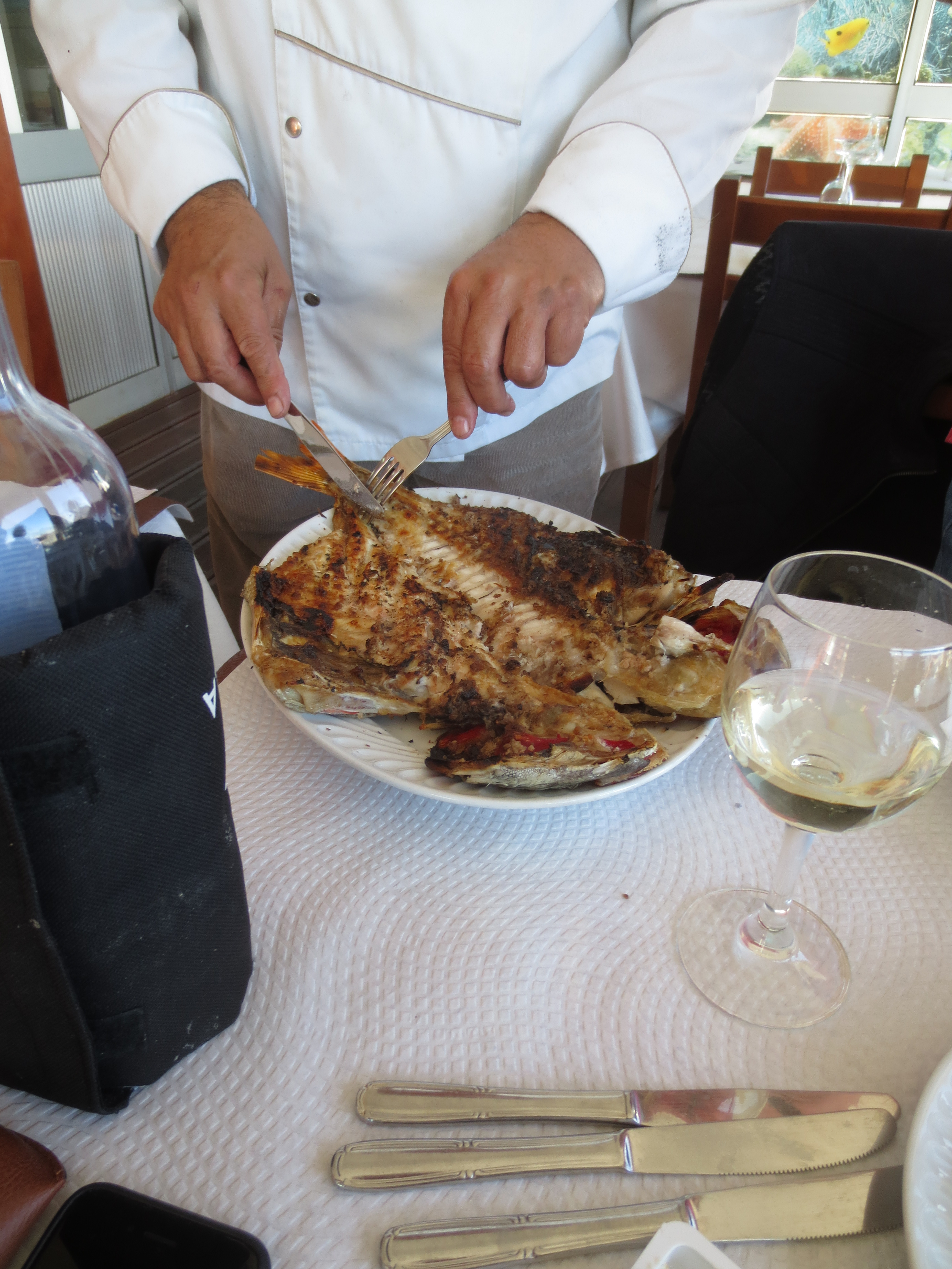We rent a BMW station wagon and all of our luggage barely fits. Deja vous , hey Shelley? We stop in the Aviero and Vagos area to check out the beach. Then we stop for lunch. We pick out a fish for the 4 of us to share and the chef cooks it up. Yum! Something of interest that we saw while driving through a forested area was tappings nad pails hanging off of the pine trees. Apparently, it is to collect pine resin to make turpentine.