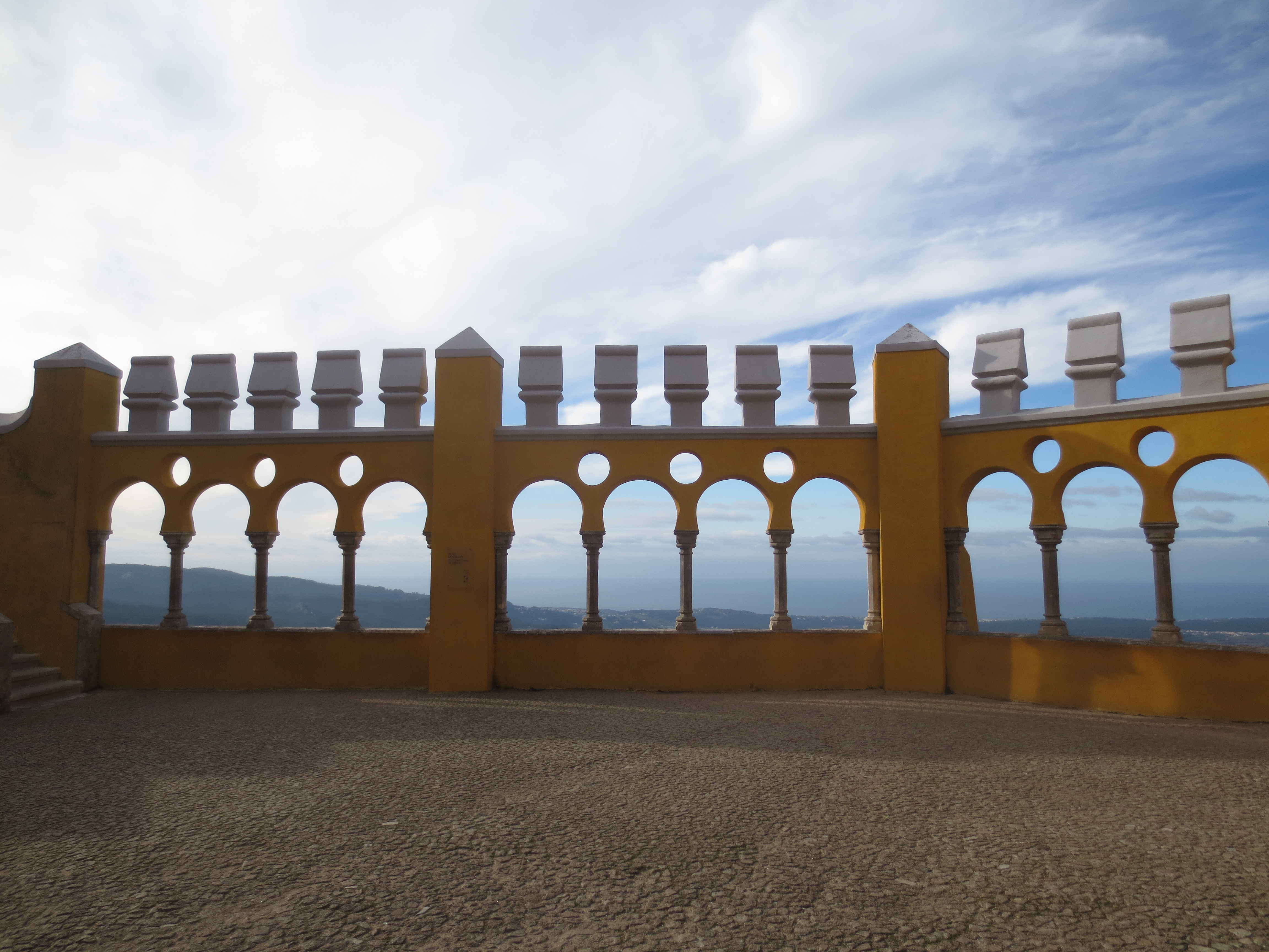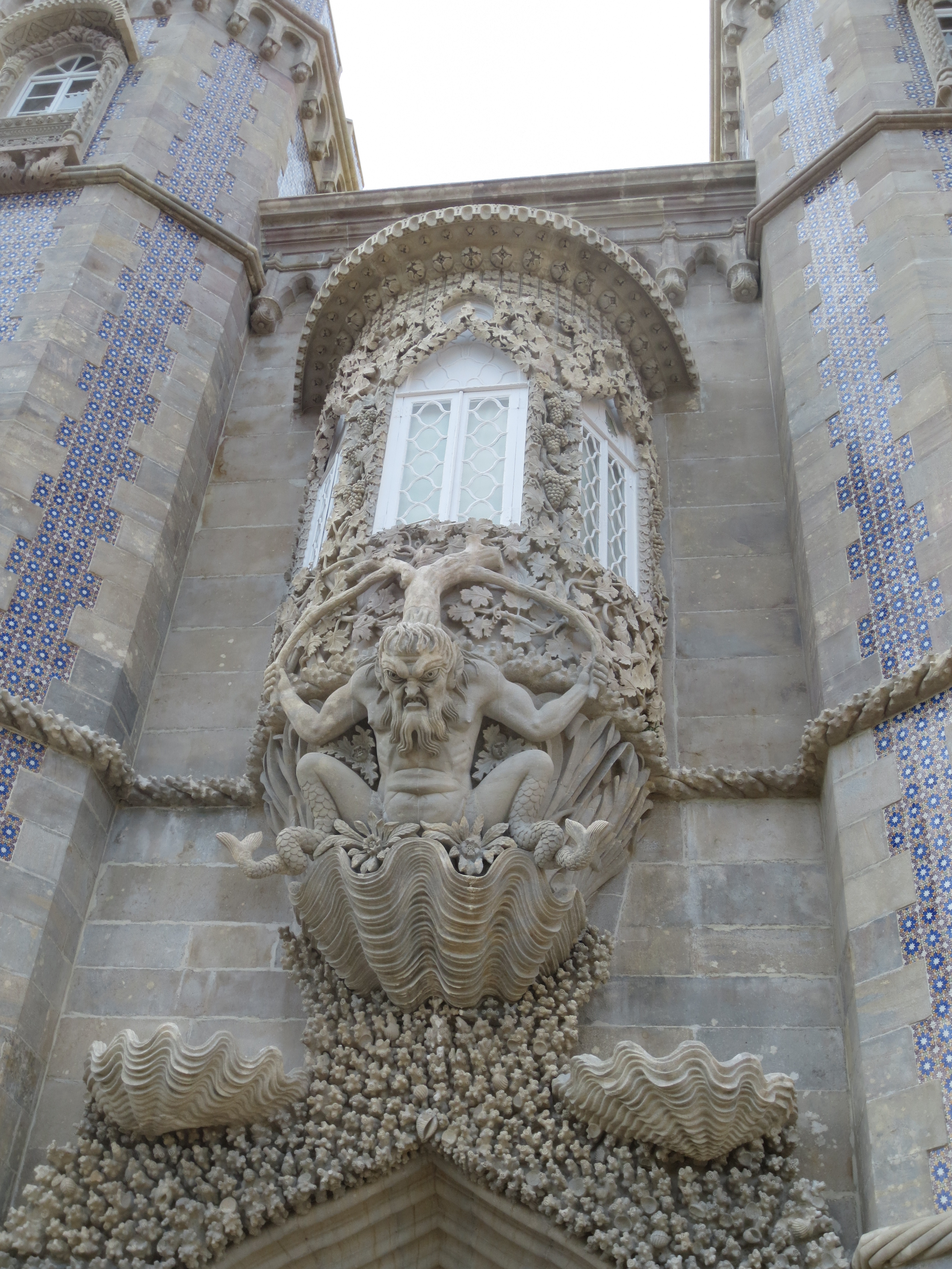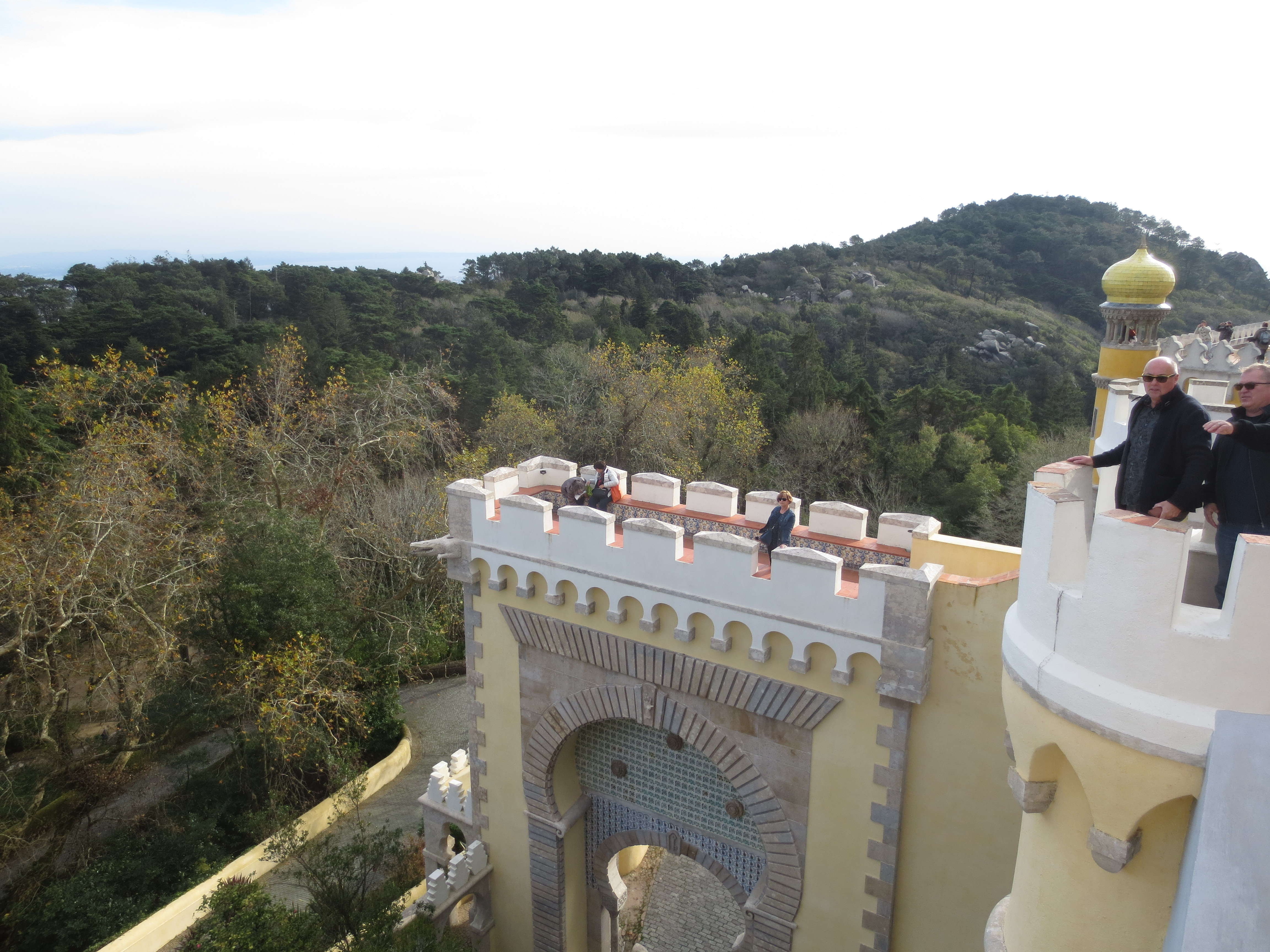 Continued south to Sintra. Beautiful country side. From the highway you can see castle with village inside the wall called Obidos. Also see old windmills and new wind turbines. On the way up to the castle we are behind a bus and it is so narrow. At one point, the bus has an issue with a BMW with his wheels turned out and the bus driver can’t get by. Dave goes up to help the bus driver but the bus driver will not trust Dave’s guidance to guide him past the BMW. Finally the owner of the BMW comes along. Meanwhile the traffic is backed up. Anyway, we finally get up to the castle bases and then we climb up to go in. Wow! ……. the palace of Pena.