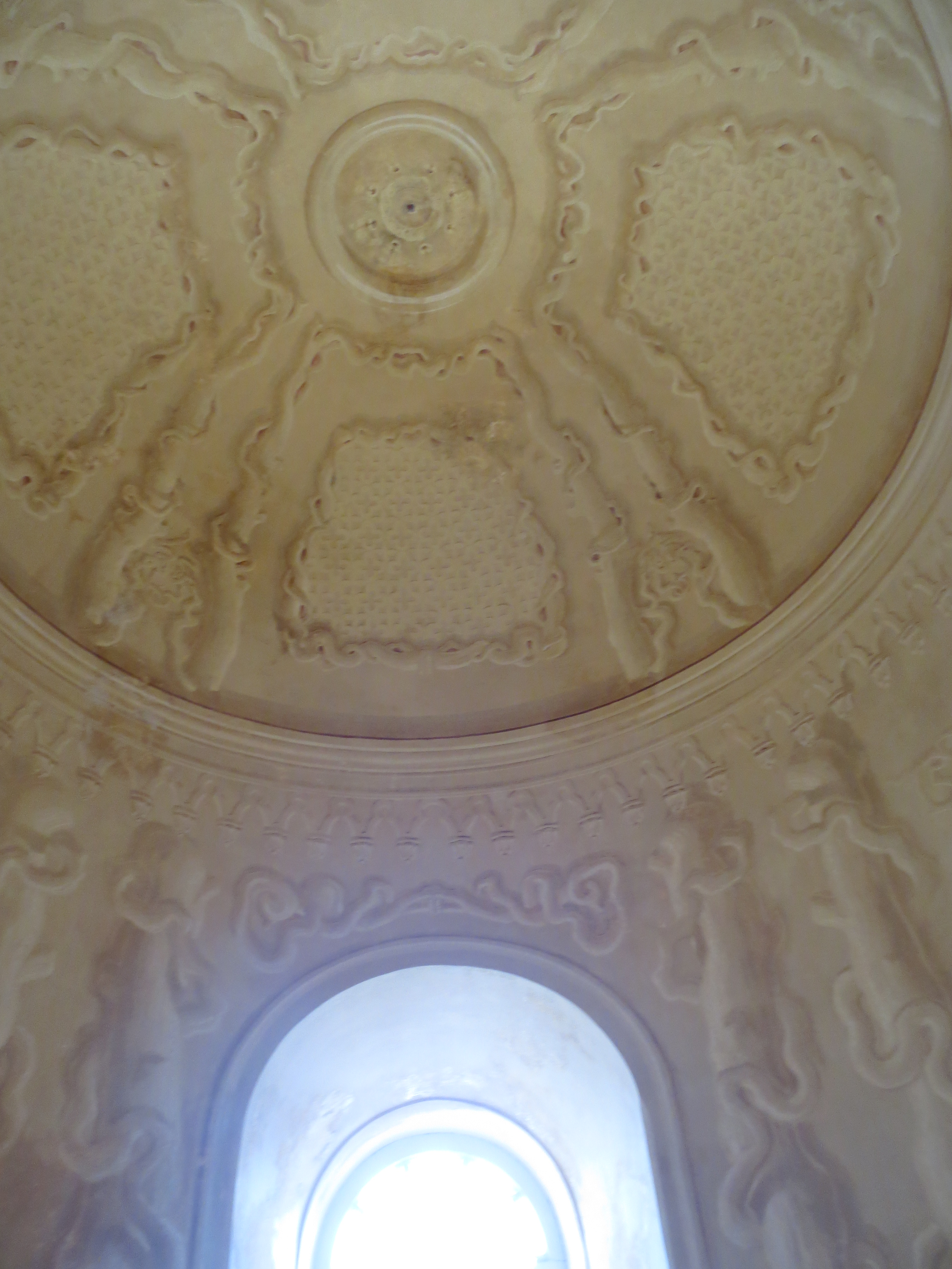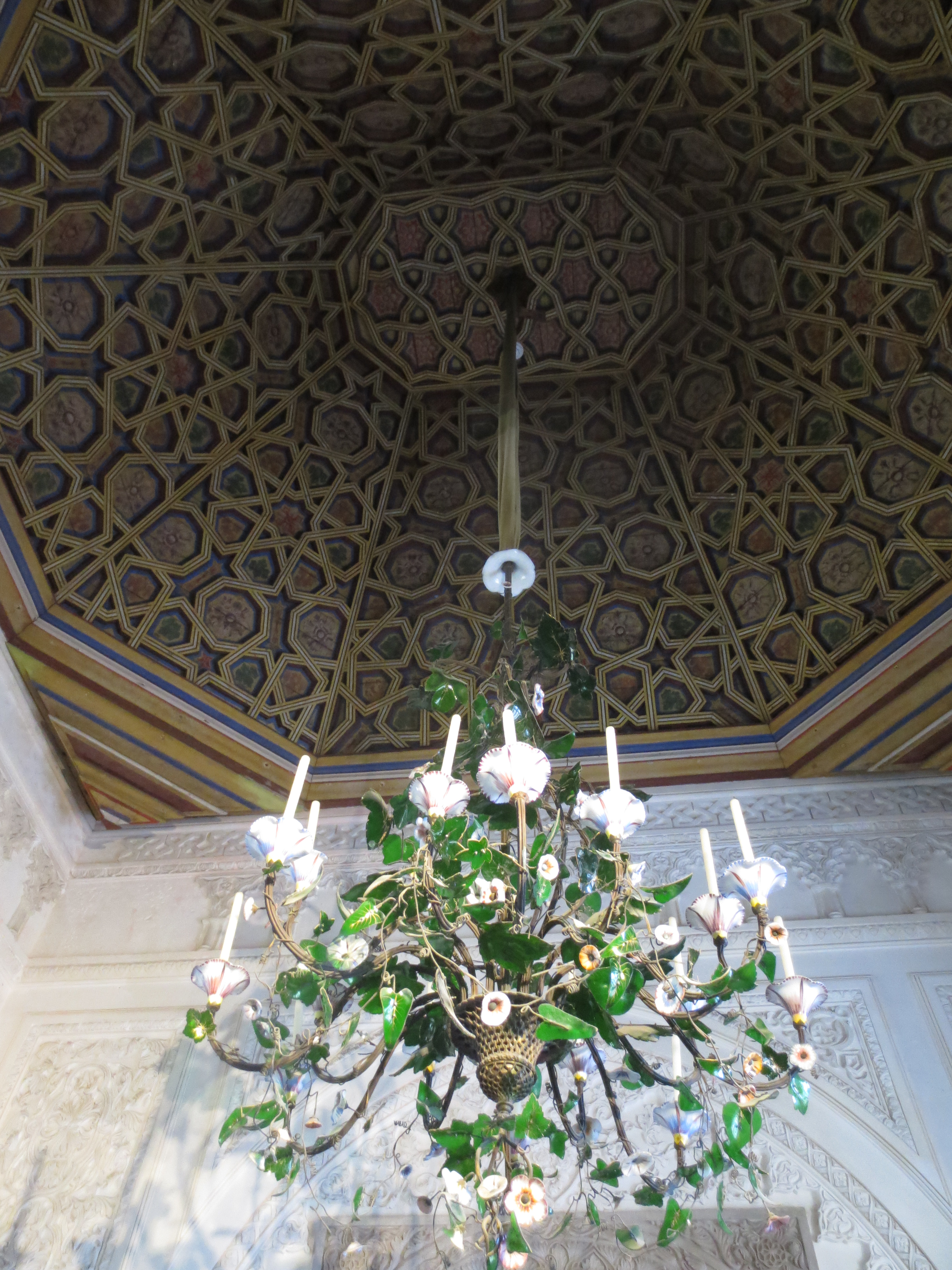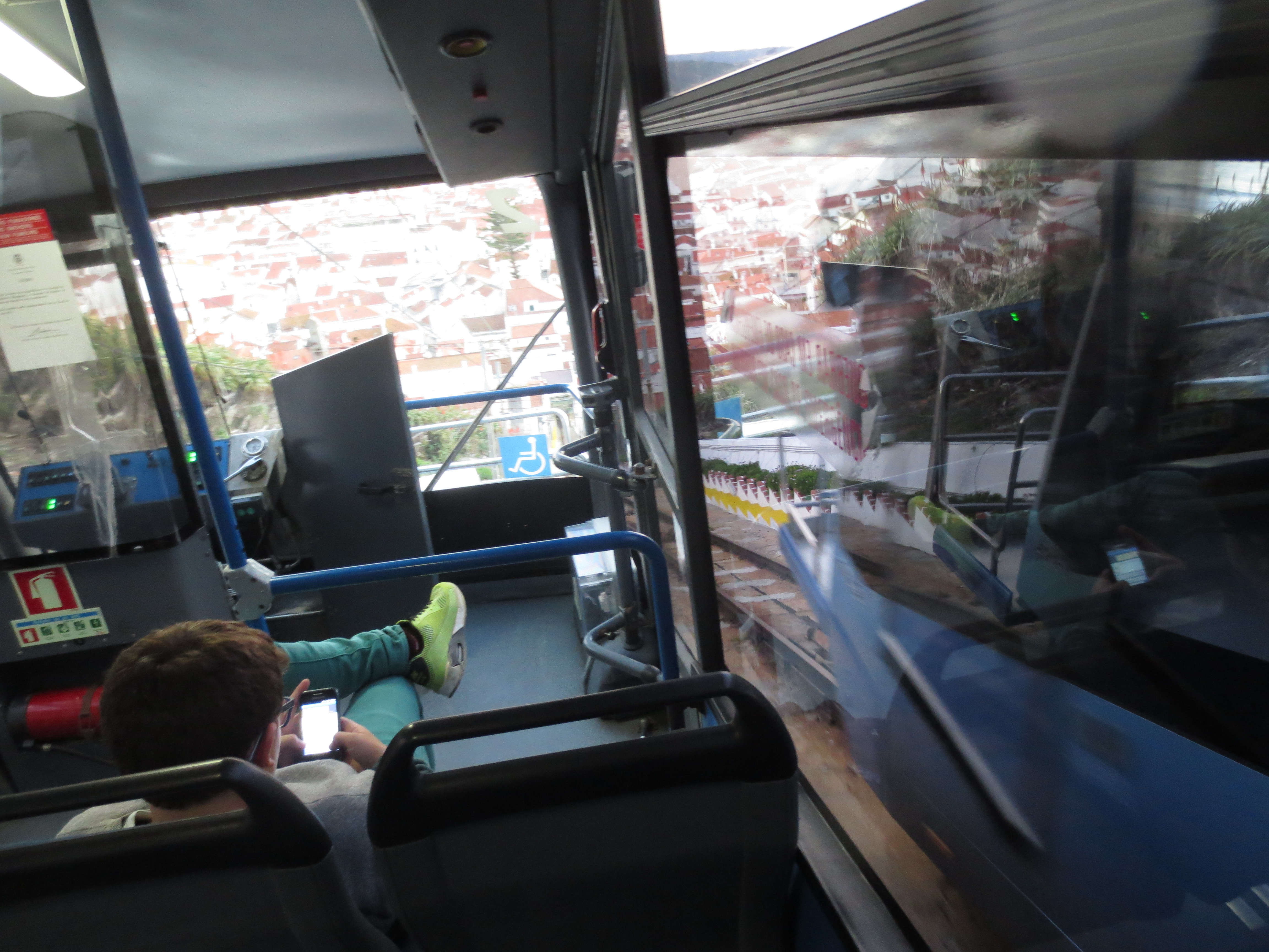 Continued south to Sintra. Beautiful country side. From the highway you can see castle with village inside the wall called Obidos. Also see old windmills and new wind turbines. On the way up to the castle we are behind a bus and it is so narrow. At one point, the bus has an issue with a BMW with his wheels turned out and the bus driver can’t get by. Dave goes up to help the bus driver but the bus driver will not trust Dave’s guidance to guide him past the BMW. Finally the owner of the BMW comes along. Meanwhile the traffic is backed up. Anyway, we finally get up to the castle bases and then we climb up to go in. Wow! ……. the palace of Pena.