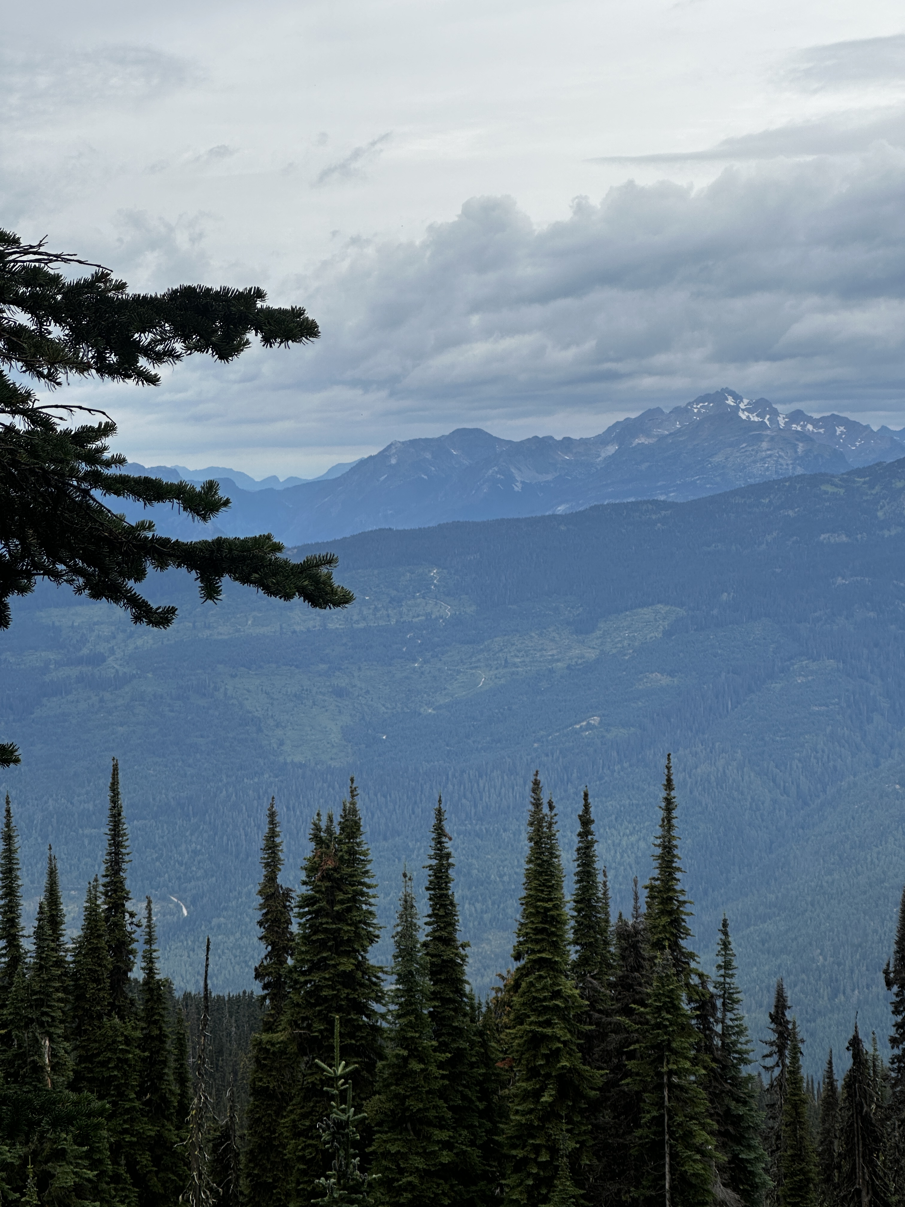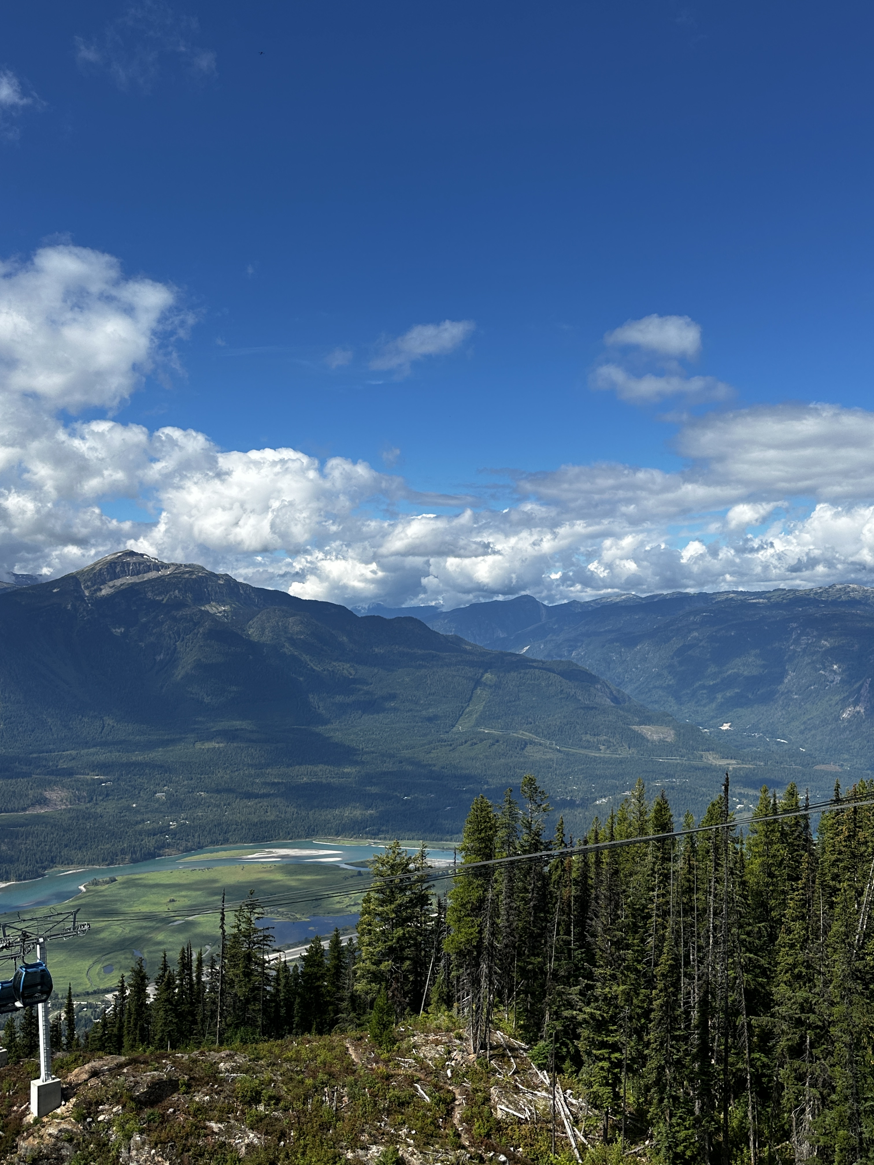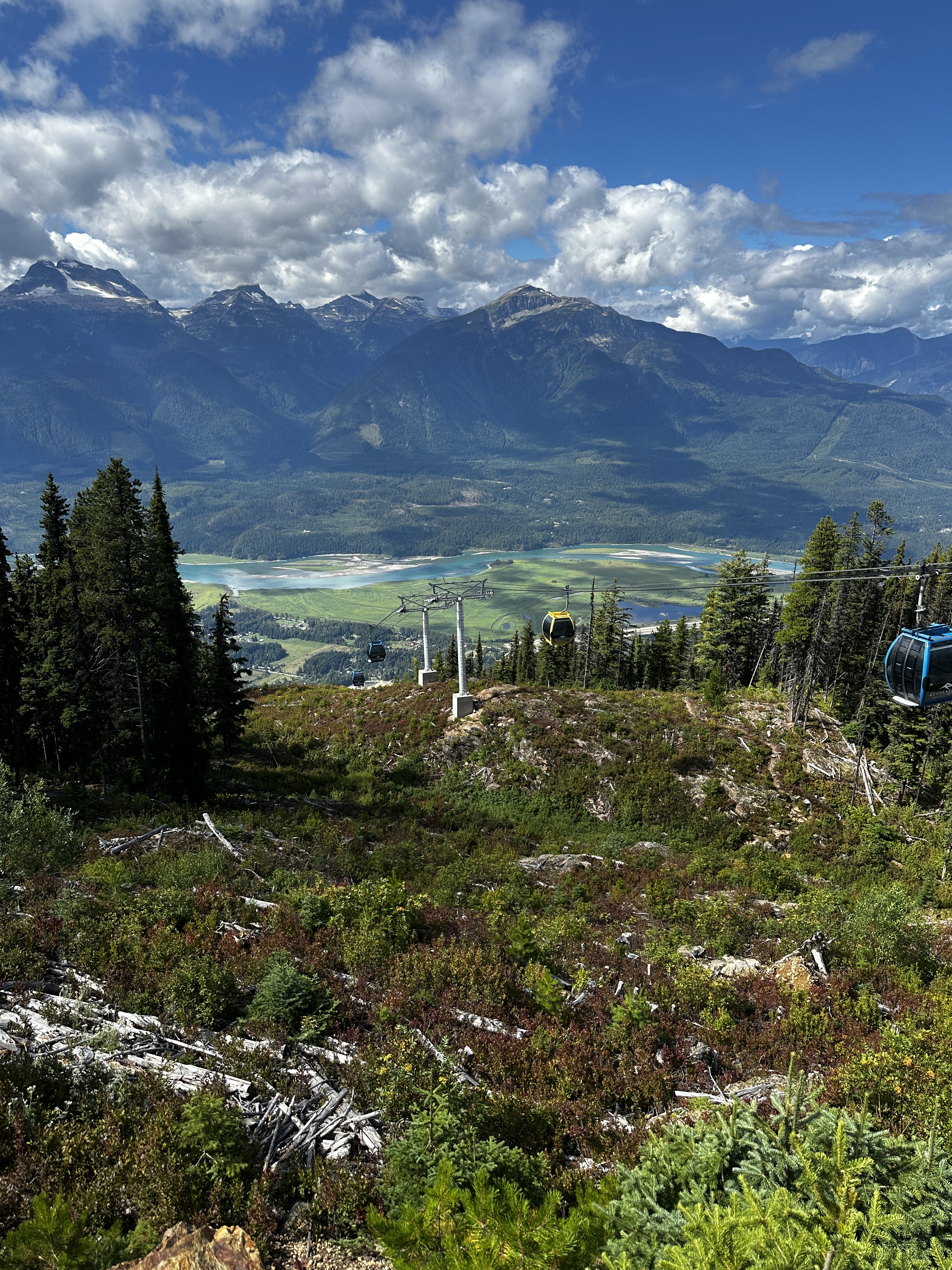 We got smart on the following day, and traded hiking boots for gondola tickets, gliding up Mount Mackenzie instead. Now this felt civilized—no pain, just instant scenery. From the top, we soaked up incredible views of the Monashees, including Mount Begbie, Blanket Mountain, and the impressive Blanket Glacier. That last one holds some history: Neil actually heli-skied there back in the 80s.